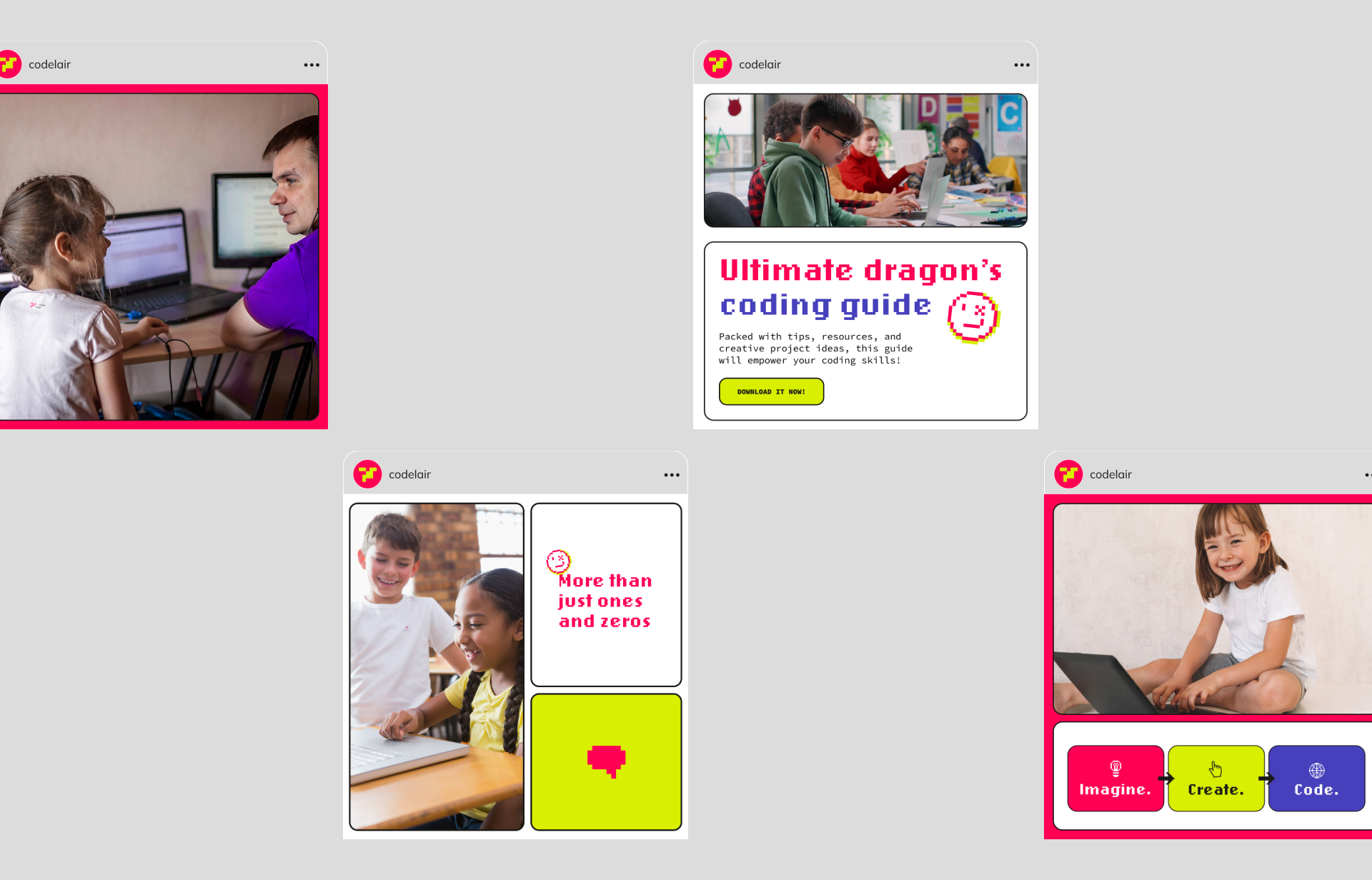 Eric then brought me in and entrusted me with the mission of translating this vision into a unique brand. Thus, the pixelated and structured design of Codelair was born, an aesthetic that evokes nostalgia, inspired by classic pixel art games, which also facilitates reading and comprehension, inviting every child to dive into a universe of discovery.